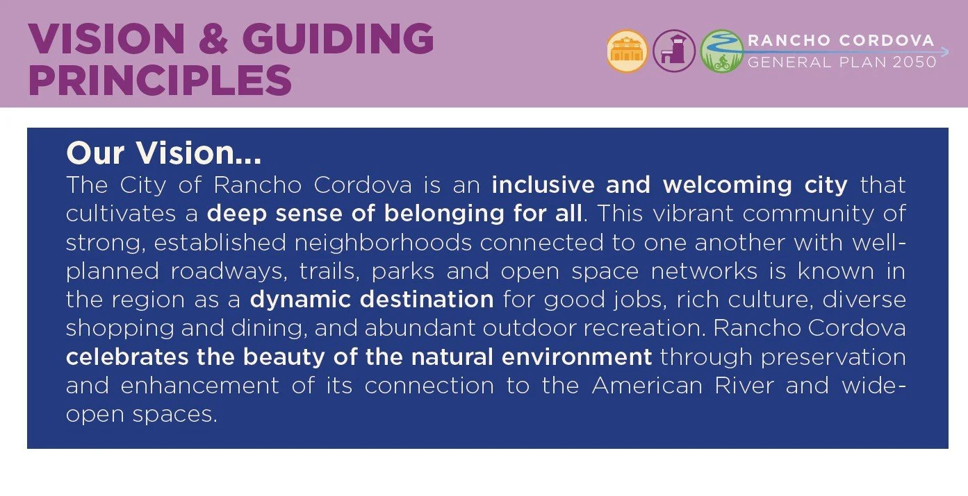 Welcome to the City of Rancho Cordova General Plan Update website! As we embark on updating our General Plan, this site serves as your resource to provide input, track progress, review documents, and engage in this important project.